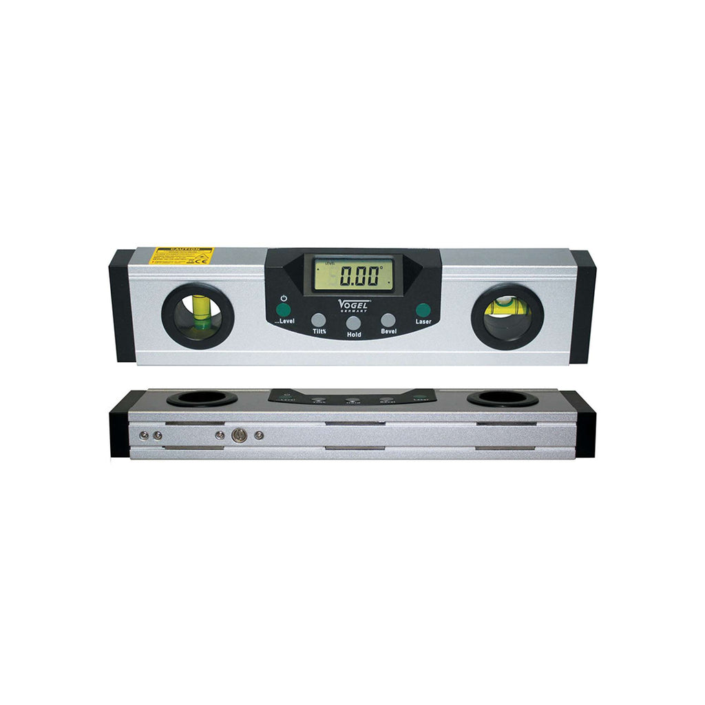 WITH CROSS-SHAPED LASER, ANGLE AND DEVIATION INDICATOR, PERCENTAGE, STURDY RECTANGULAR PROFILE, MADE OF LIGHT ALLOY WITH, GROOVED SURFACE, LARGE LCD DISPLAY, HEIGHT OF DIGITS 10 MM, READABLE FROM ALL DIRECTIONS, DISPLAY INTERCHANGEABLE IN ANGLE, PERCENTAGE AND TANGENT MEASUREMENT MODES, ON/OFF BUTTON, HOLD AND DATA STORAGE FUNCTIONS, MAGNETIC INSERTS AT THE BOTTOM AND M6 THREAD FOR TRIPOD ATTACHMENT, WITH ONE HORIZONTAL AND ONE VERTICAL VIAL, WITH AUTO-CALIBRATION, BATTERY 1 X 9 V INCLUDED (TYPE 6LR61)