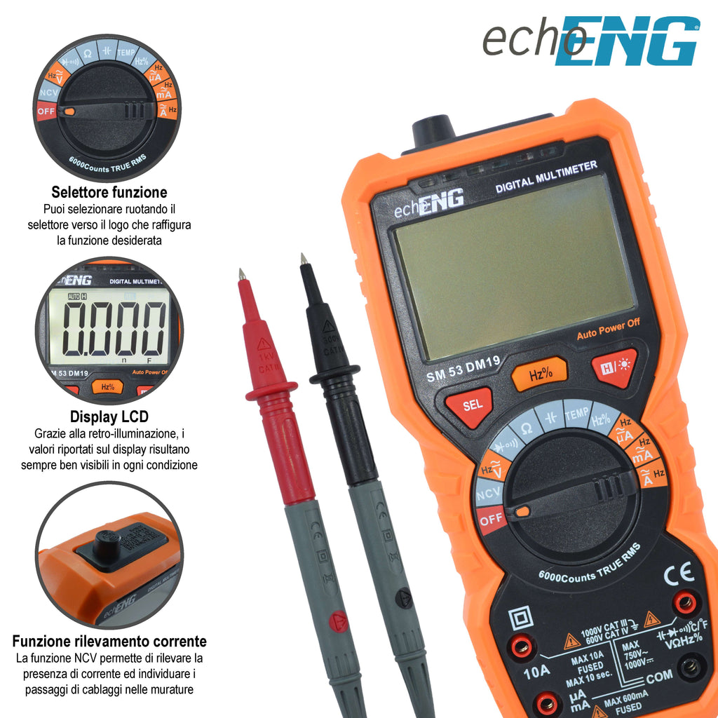 Compact Digital Multimeter – 6000 Counts TRUE RMS, Built-in Thermometer, AC/DC Voltage Measurement up to 600V, CAT IV 600V / CAT III 1000V - echoENG SM 53 DM19The echoENG SM 53 DM19 Automatic Digital Multimeter is the ideal tool for electricians, technicians, and hobbyists who seek precision, safety, and advanced features in one compact device.Thanks to its non-contact voltage detection (NCV) and LED-illuminated LCD display, this multimeter is perfect for working safely even in poorly lit environments.Key FeaturesNCV Technology (Non-Contact Voltage): detects the presence of current without direct contact, with acoustic signal and indicator LEDsImmediate signaling LEDs:Green light for resistance ≤40ΩRed light for resistance ≥40Ω–60ΩHigh-visibility LCD display with LED backlightMultifunction HOLD button to quickly save and delete data from memoryAuto Power-Off after 15 minutes of inactivityTrue RMS: maximum accuracy in reading alternating voltages and currentsIncluded AccessoriesMeasurement probesType K thermocoupleTechnical SpecificationsFeature ValueDisplay 6000 Counts, LED-backlit LCDMax input voltage 1000 VDC / 750 VACAC frequency response 40 Hz – 1 kHz True RMSVoltage range (Hz) 200 mV – 10 V ACOverload protection 600 V AC/DCOpen circuit voltage 1 VDiode open circuit voltage 3.2 VDC current 6 μA – 0.01μA / 10.00 A – 10 mA ±(1.2% reading + 3 digits)AC current 6 μA – 0.01μA / 10.00 A – 10 mA ±(1.5% reading + 3 digits)Capacitance 6 nF – 0.001 nF / 100 mF – 0.01 mF ±(5.0% reading + 3 digits)Maximum current input 600 mA AC/DC – 10 A AC/DCMeasurable temperature from -20°C to +100°C / -4°F to +1832°FSafety category 600V CAT IV – 1000V CAT IIIAutomatic shutdown After 15 minutes of inactivityNCV visual and acoustic indicator Red LED ≥40Ω–60Ω / Green LED ≤30ΩPower supply 2 x 1.5V AA batteriesDimensions 190 x 89 x 50 mm