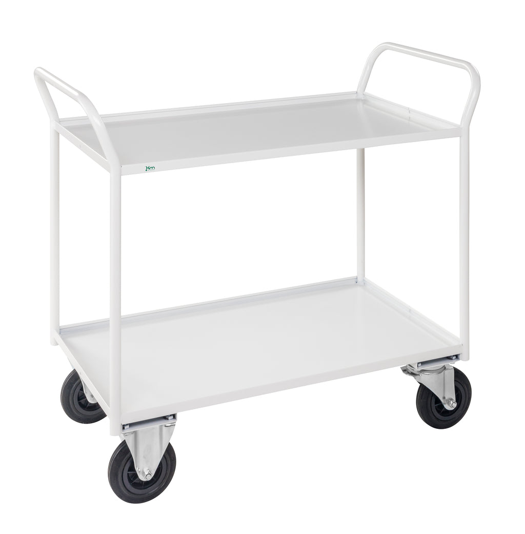Fully welded robust trolley in sheet metal with rim, 2 shelves. Perfect for heavier objects.