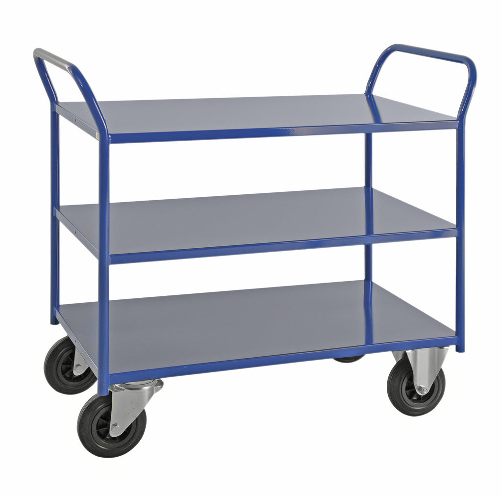 Fully welded robust trolley in sheet metal without rim, 3 shelves. Perfect for heavier objects. Blue