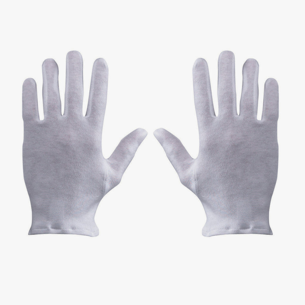 Knitted cotton, gusseted fingers, light, white, sewn-in work, hemhemmed.Length 220 mm.