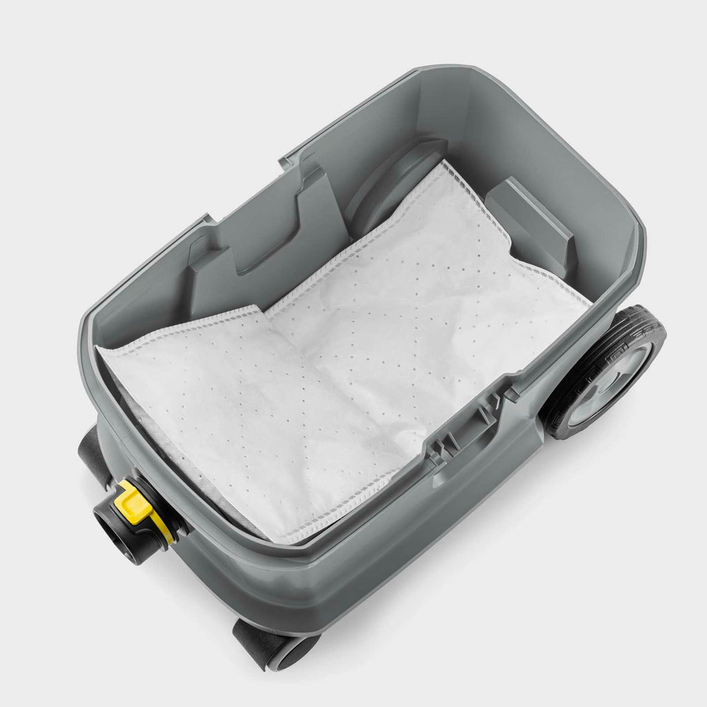 Innovative T 10/1 Bp cordless vacuum cleaner: sustainable, made from 45% recycled material*, powerful, quiet, ergonomic, and with eco!efficiency mode. Ideal for hotels, restaurants, individual retailers, and building cleaners. The T 10/1 Bp battery-powered vacuum cleaner from Kärcher impresses with its sustainability, durability, and attractive price-performance ratio. It also stands out thanks to its robustness, range of accessories, and excellent suction power thanks to the powerful Kärcher Battery Power+ batteries (36 V). The 45% recycled material* used in its production saves resources and reduces energy consumption. The powerful T 10/1 Bp is notable for its low noise level of only 57 dB(A), meaning it can be used at any time, even in noise-sensitive areas. The compact vacuum cleaner is easy to handle and has a capacity of 10 liters. It is equipped with a carrying handle and can be transported ergonomically and close to the body. It is also extremely robust, equipped with accessory storage, bumpers, and large wheels. An ultra-efficient HEPA 14 filter is also available. When ordering, please note that the battery and compatible quick charger must be ordered separately.