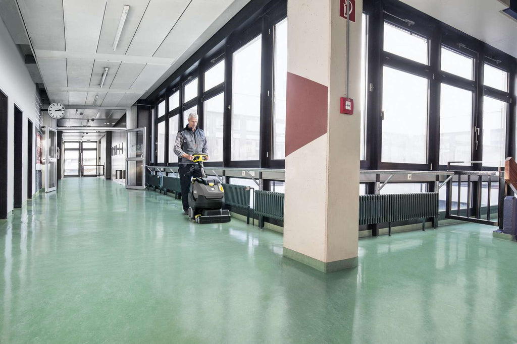 The fully equipped, battery-powered BR 45/22 C Bp Pack floor scrubber dryer features a rotating roller brush head and KART technology for maximum maneuverability and performance on large surfaces. Even on large areas, practical use is often restricted by limited height clearances. The BR 45/22 C Bp Pack is the ideal choice for such situations. Equipped with a roller brush head featuring KART technology (Kärcher Advanced Response Technology), which can rotate 200 degrees in both directions, and with a wide working width, it is exceptionally maneuverable and therefore ideal for heavily furnished areas. At the same time, the positioning of the brush and squeegees—always transverse to the direction of travel—ensures increased area performance and a consistently uniform cleaning result. The integrated high-performance lithium-ion batteries provide up to three times longer runtime than conventional lead-acid batteries and are completely maintenance-free. By using the innovative eco!efficiency mode, battery runtime can be further extended and operating noise reduced by around 40%. The optional HEPA filter filters the exhaust air from dirty water, enabling work in hygiene-sensitive areas.