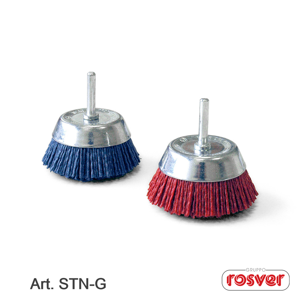 Nylon wire is more flexible and break resistant than the steel wire. It scratches less and does not rust the workpiece. On metals it removes oxide and paint residues, on wood it prepares the surface.