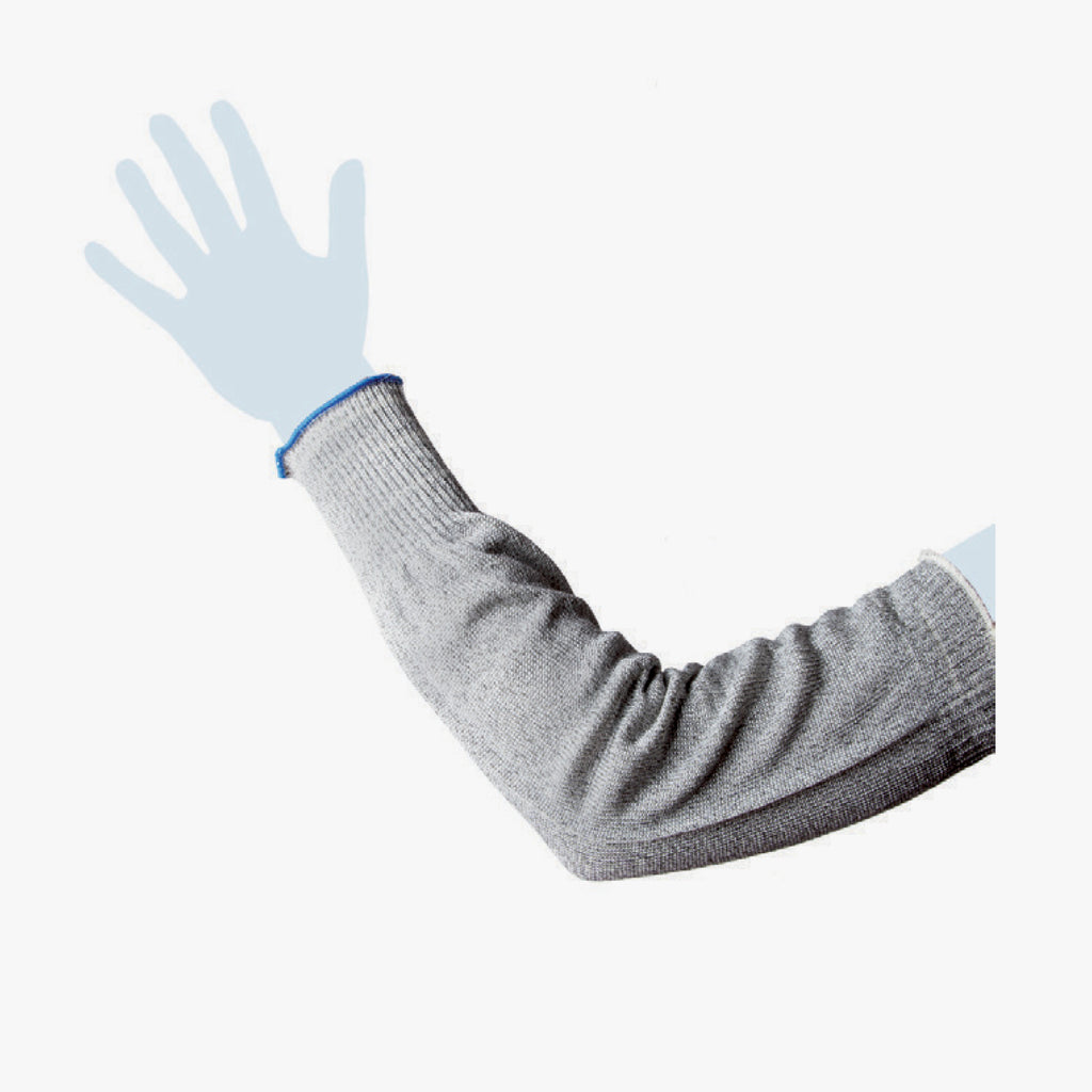 Protective sleeve made of gray cut-resistant composite yarn knit.