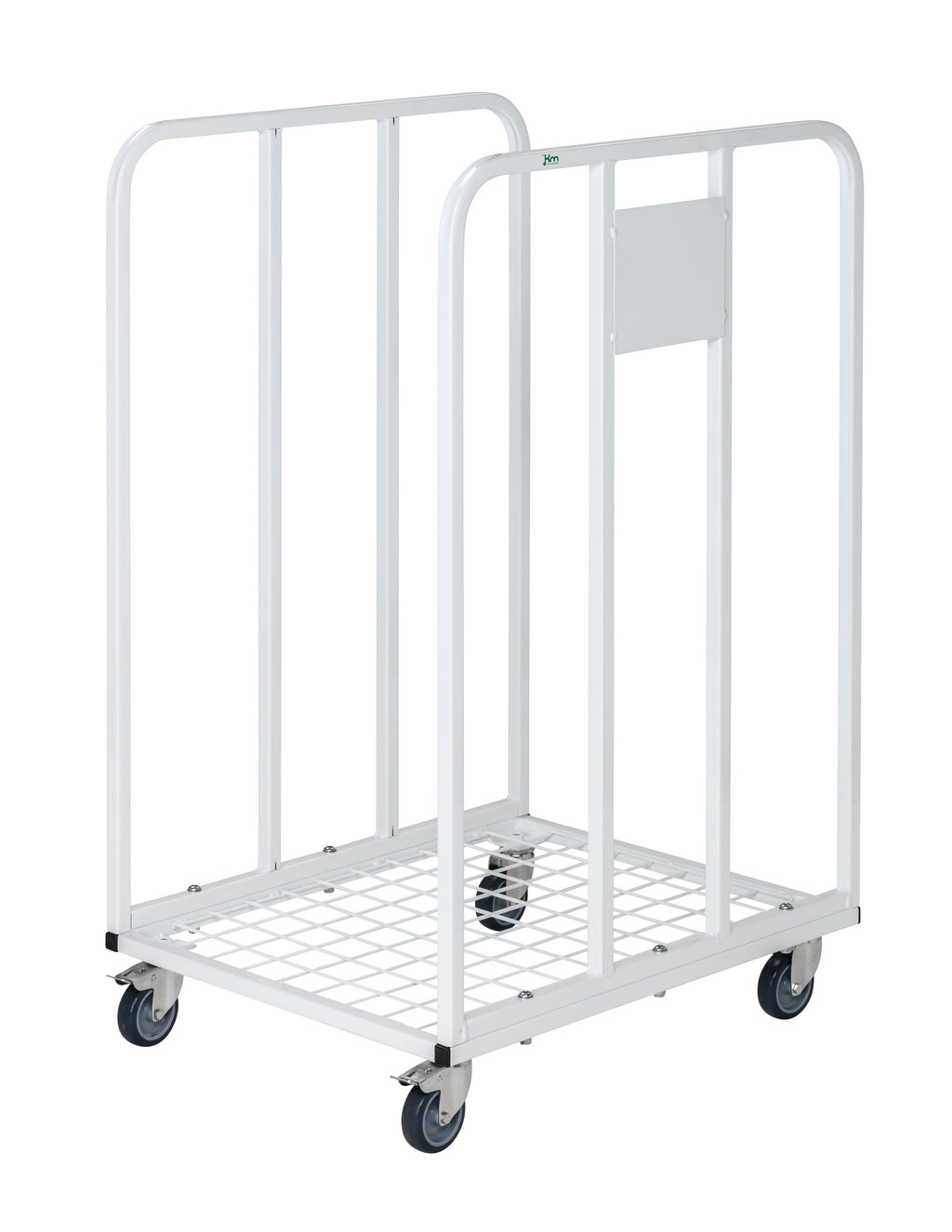 Small flexible white powder coated rolling container for corrugated cardboard for offices with 50 mm mesh at the bottom. 4 pcs 100 mm swivel castors, 2 of which brakes. Ideal for storage/moving of cardboard boxes/light boards