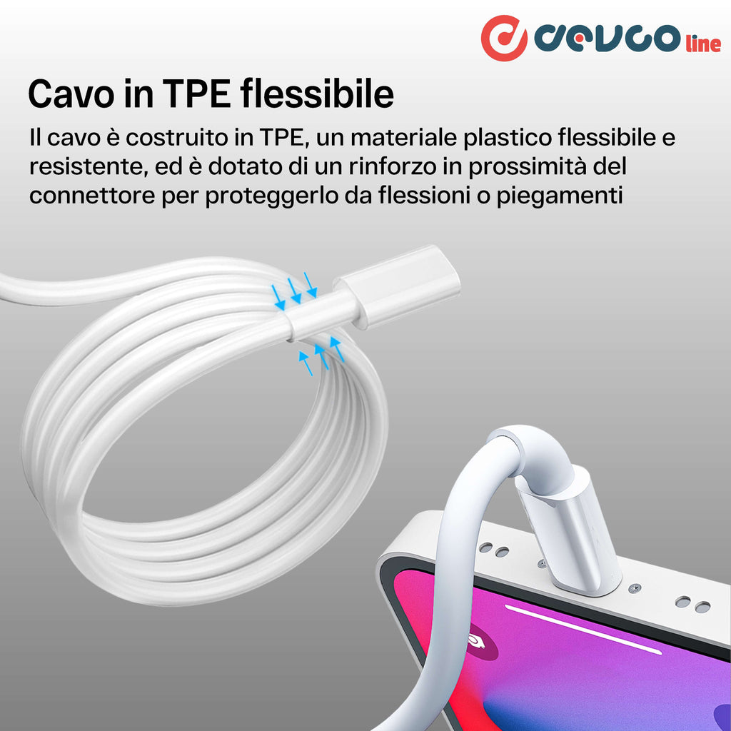 The DEVCOline charging cable is equipped with a USB-C connector and a lightning type terminal suitable for the latest generation iPhones.