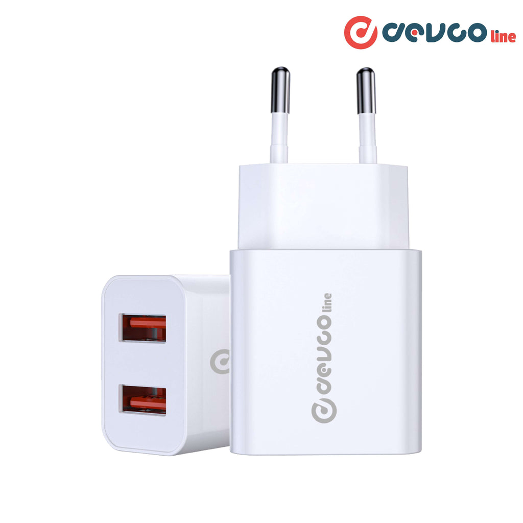 The DEVCOline 10W 2xUSB wall power supply is studied and designed to simultaneously charge two devices with USB cable quickly and efficiently.